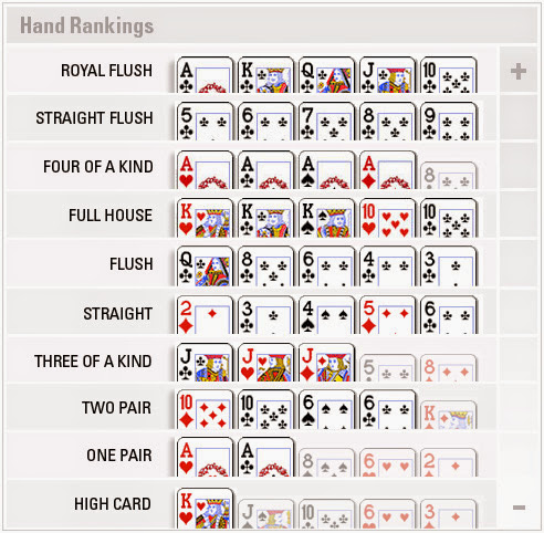 Urutan atau ranking dari kombinasi 5 kartu poker dari yang terbaik sampai yang terendah adalah :